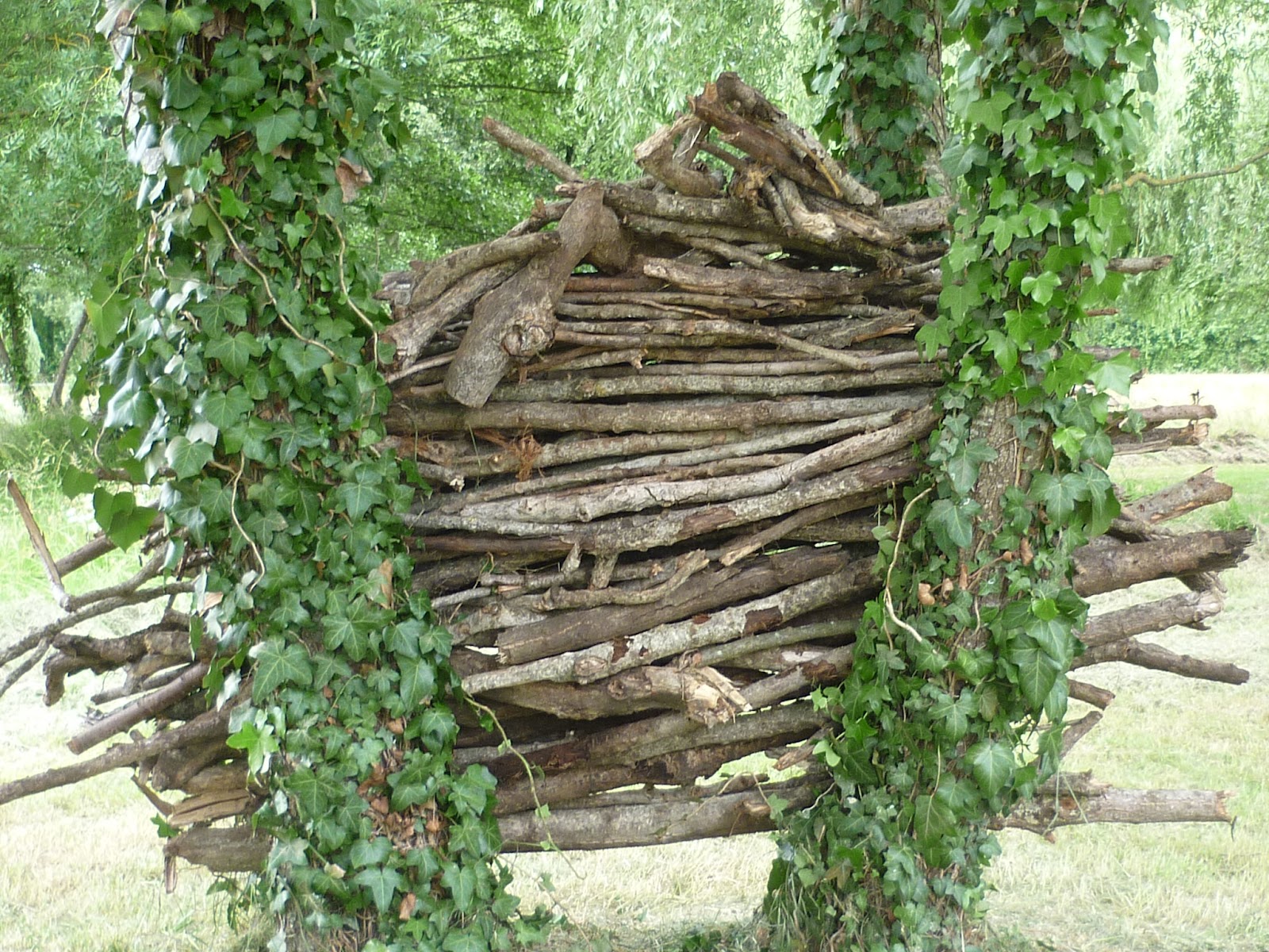 avec des branches pour créer de nouvelles lignes et de nouveaux volumes dans la clairière . Le résultat et le choix de travail ne sera pas le même en fonction de l'écartement des troncs . Regard sur une photographie d'une réalisation esprit "dentelle " entre les branches d'un arbre .